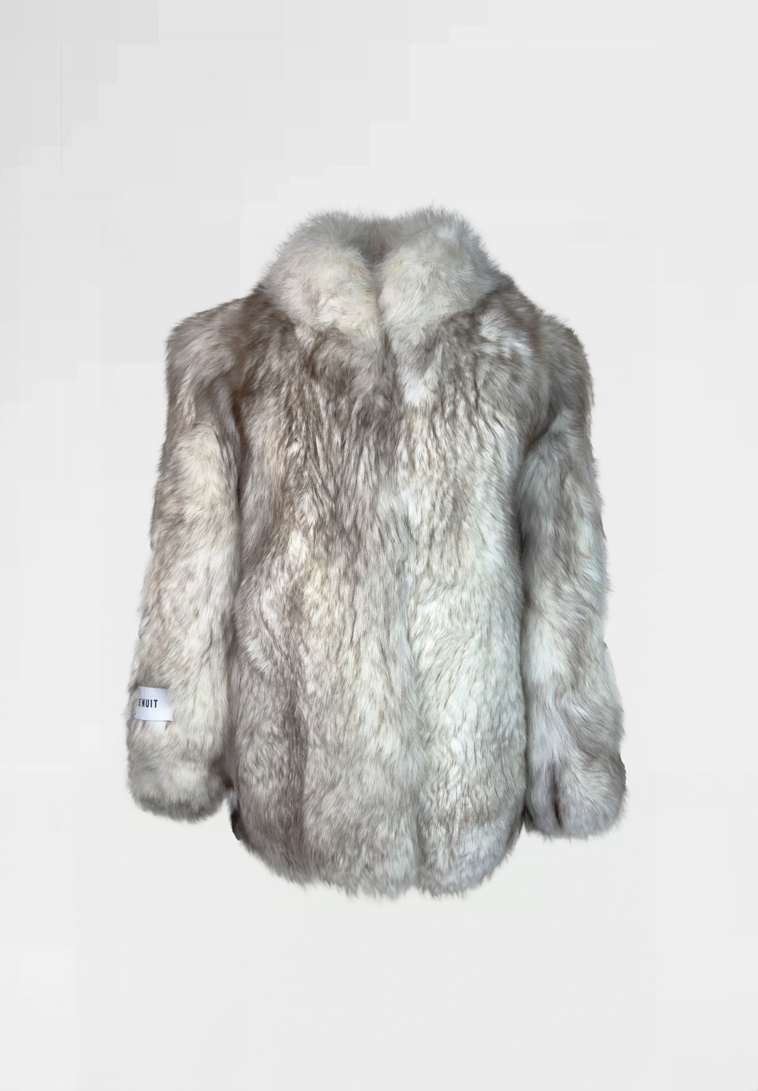 DESCRIPTION: Coat 201 is a shorter, structured fox fur coat in a beige tone, enriched...