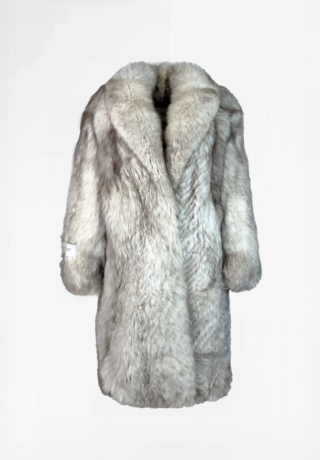 DESCRIPTION: Coat 204 is a premium fox fur coat in a dark beige tone, featuring...